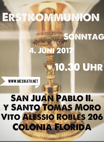 Am kommenden Sonntag feiern wir die Erste Heilige Kommunion um 10.30 Uhr in der Kirche St. Johannes Paul II. und St. Thomas Morus. Die Feier der Hl. Messe beginnt um 10.30 Uhr und wird zweisprachig auf Deutsch und auf Spanisch gefeiert. Sieben Kinder haben sich intensiv auf diesen Tag vorbereitet. Bitte begleiten Sie die Kinder mit Ihrem Gebet.