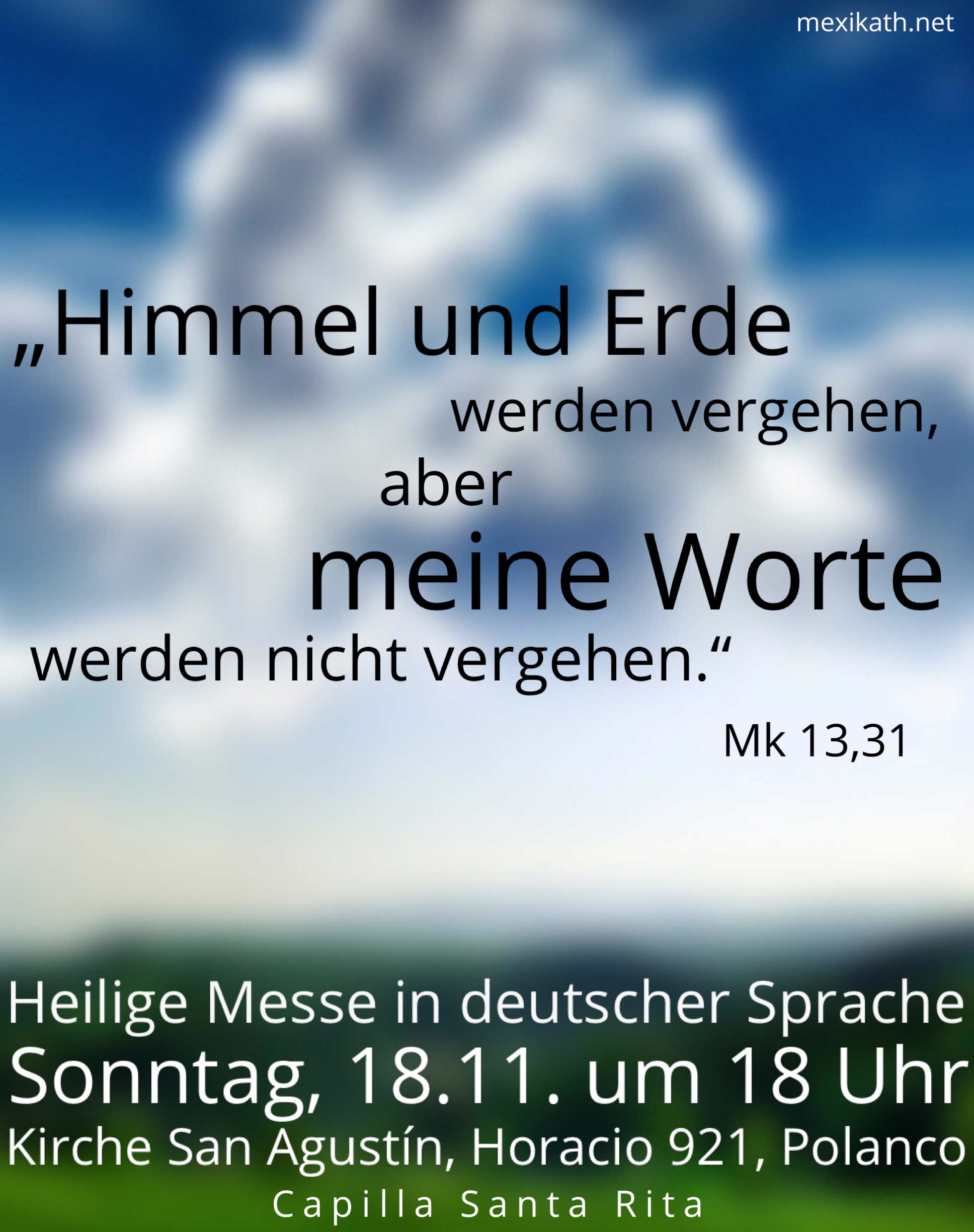 El domingo 18 de noviembre habrá otra Santa Misa en el idioma alemán en la Iglesia de San Agustín en Polanco. Empezamos a las 6pm en la Capilla Santa Rita, al lado derecho del altar mayor.