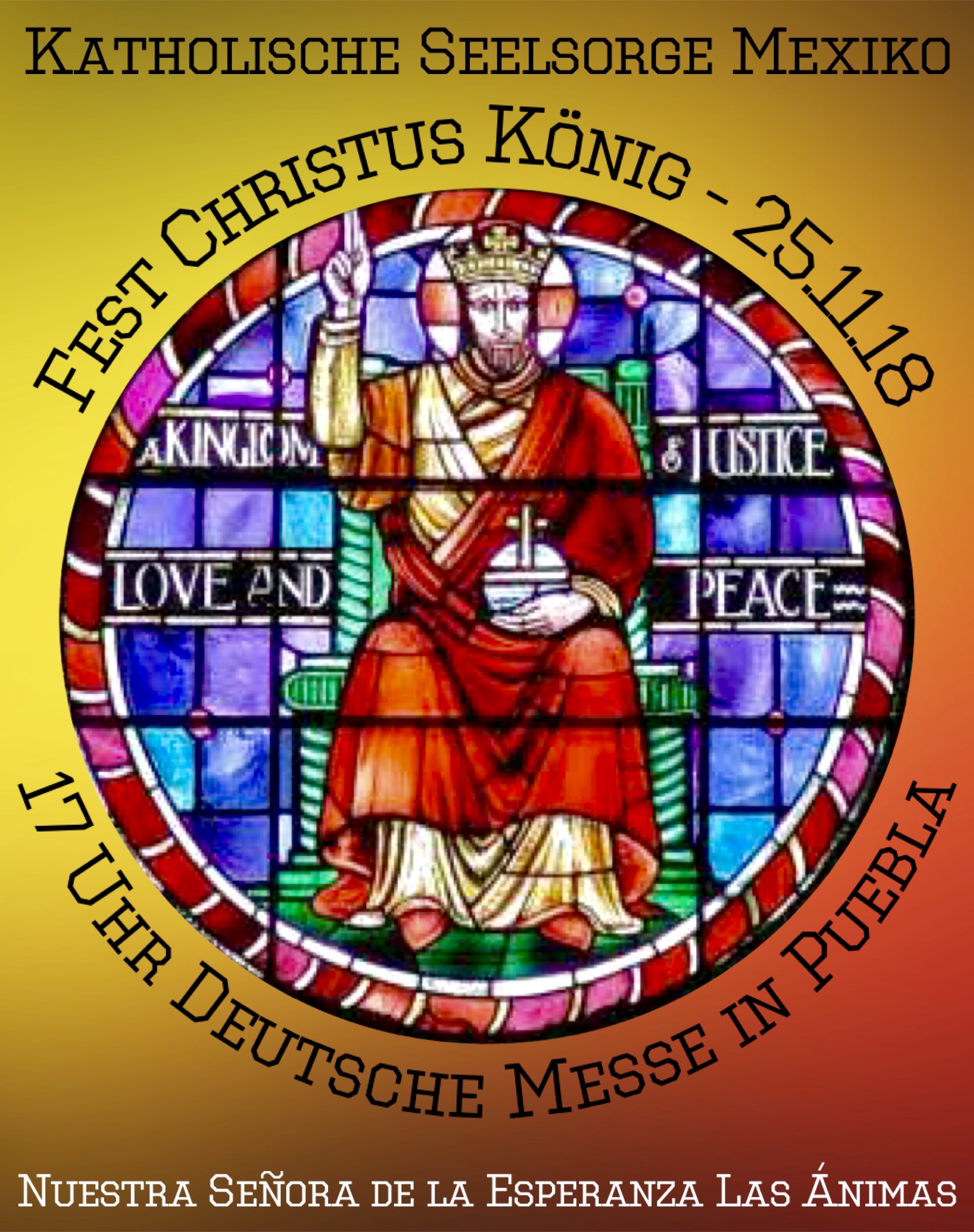 Am kommenden Sonntag, dem 25.11. feiern wir eine Heilige Messe in deutscher Sprache in Puebla. Es ist das Christkönigsfest, mit dem das Kirchenjahr zu Ende geht. Der Gottesdienst beginnt um 17 Uhr in der Kirche Nuestra Señora de la Esperanza in Las Animas, in der Kapelle von Guadalupe unter der eigentlichen Kirche. Herzliche Einladung!