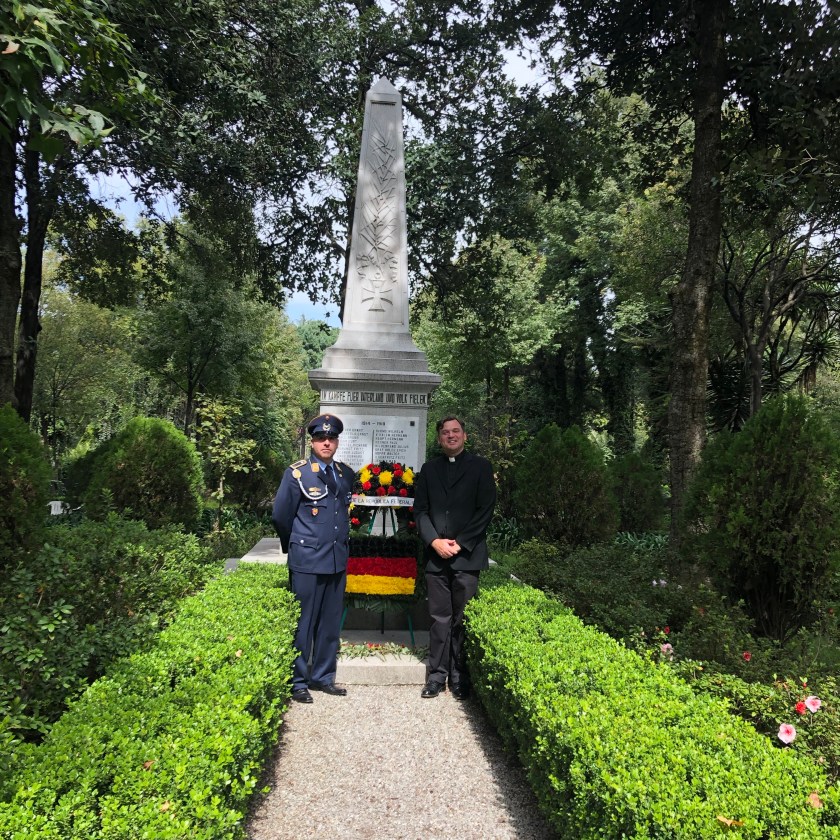 Der deutsche Friedhof in Mexiko-Stadt ist ein echtes Kleinod. Mitten in der turbulenten Metropole findet sich dort eine Oase der Ruhe und der Einkehr. Der Volkstrauter war auch schon in den vergangenen Jahren der Anlass für einen Ökumenischen Gottesdienst, aber erstmals fand dieser im Freien auf dem Friedhof statt. Pastor Reusch von der Deutschen-Evangelischen Gemeinde leitete die Liturgie, die in diesem Jahr den 100. Jahrestag des Ende des Ersten Weltkrieges zum Thema hatte. Pfarrer Faustmann von der Katholischen Gemeinde übernahm die Predigt.