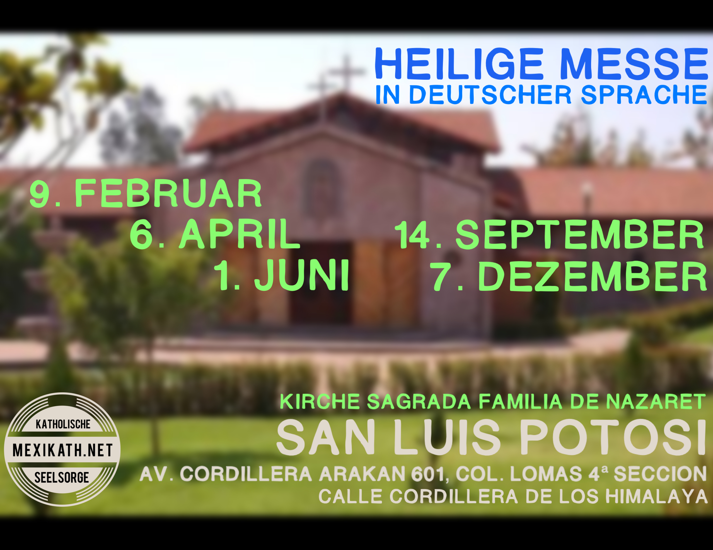 Die deutschen Gottesdienste 2019 in San Luis Potosí werden immer samstags um 16 Uhr in der Kirche Sagrada Familia gefeiert werden. Jeweils am Freitagnachmittag vor dem entsprechenden Termin sind die Kinder zu einem religiösen Kinderkreis eingeladen. Der Ort des Treffens wird vorher hier bekanntgegegeben.
