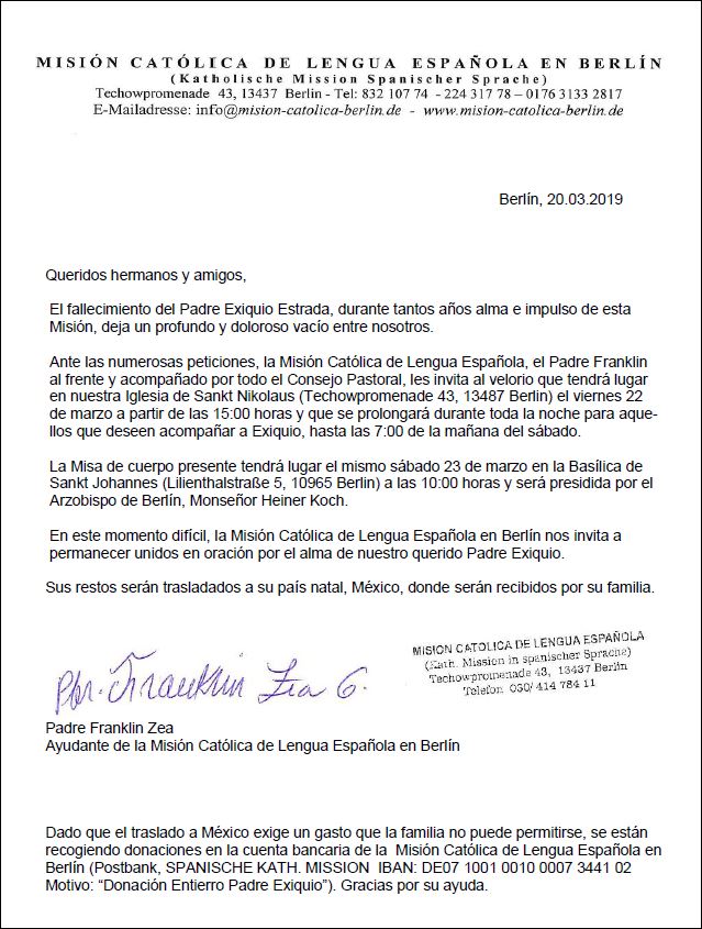 Der Priester Exiquio Estrada Ramírez gebürtig aus Guadalajara ist am vergangenen Samstag, dem 16. März 2019 in Berlin im Alter von 54 Jahren verstorben. Er war Leiter der spanischsprachigen Mission im Erzbistum Berlin. Lesen Sie hier einen Nachruf auf den Verstorbenen. R.I.P.
