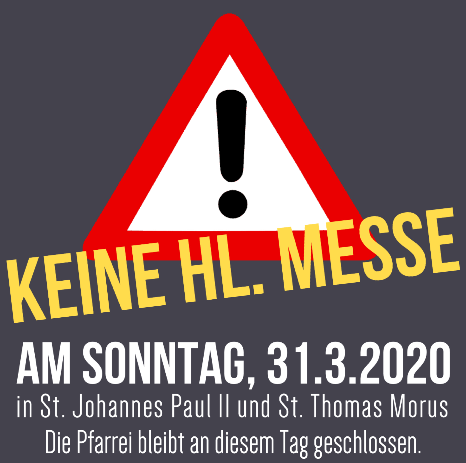 Die Heilige Messe am morgigen Sonntag, dem 31.3. um 10.30 Uhr muß entfallen. Die Pfarrei St. Johannes Paul II und St. Thomas Morus bleibt morgen geschlossen. Wir bitten um Verständnis.