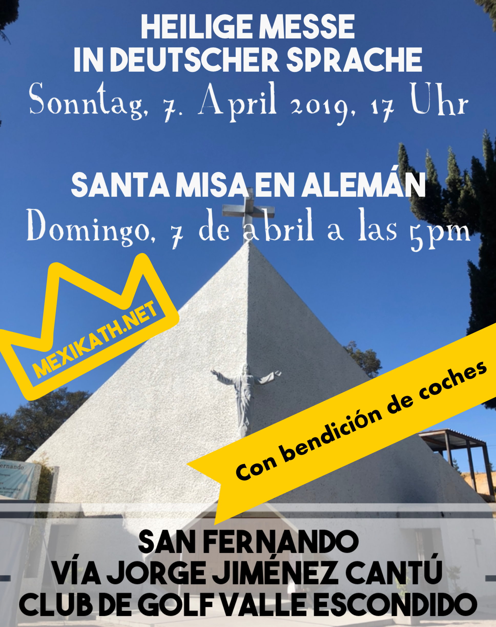La próxima Santa Misa en alemán y en español será el domingo 7 de abril a las 5pm. Esta iglesia se encuentra en la Zona Esmeralda, Vía Jorge Jiménez Cantú, Valle Escondido y Club de Golf Valle Escondido, 52937 Cd López Mateos, Méx.