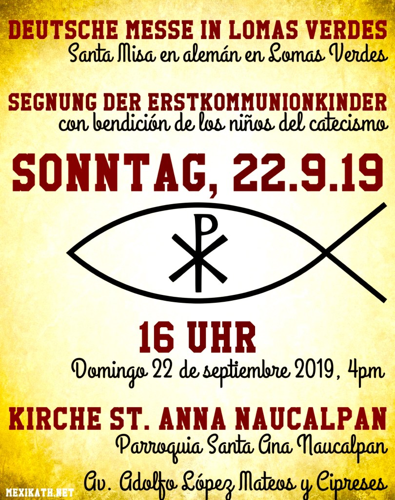 Con el nuevo año escolar empezamos otra vez con las misas en alemán cerca del Colegio Humboldt en Lomas Verdes. El domingo 22 de septiembre 2019 a las 4 de la tarde empieza la Santa Misa en pa Parroquia Santa Ana Naucalpan.