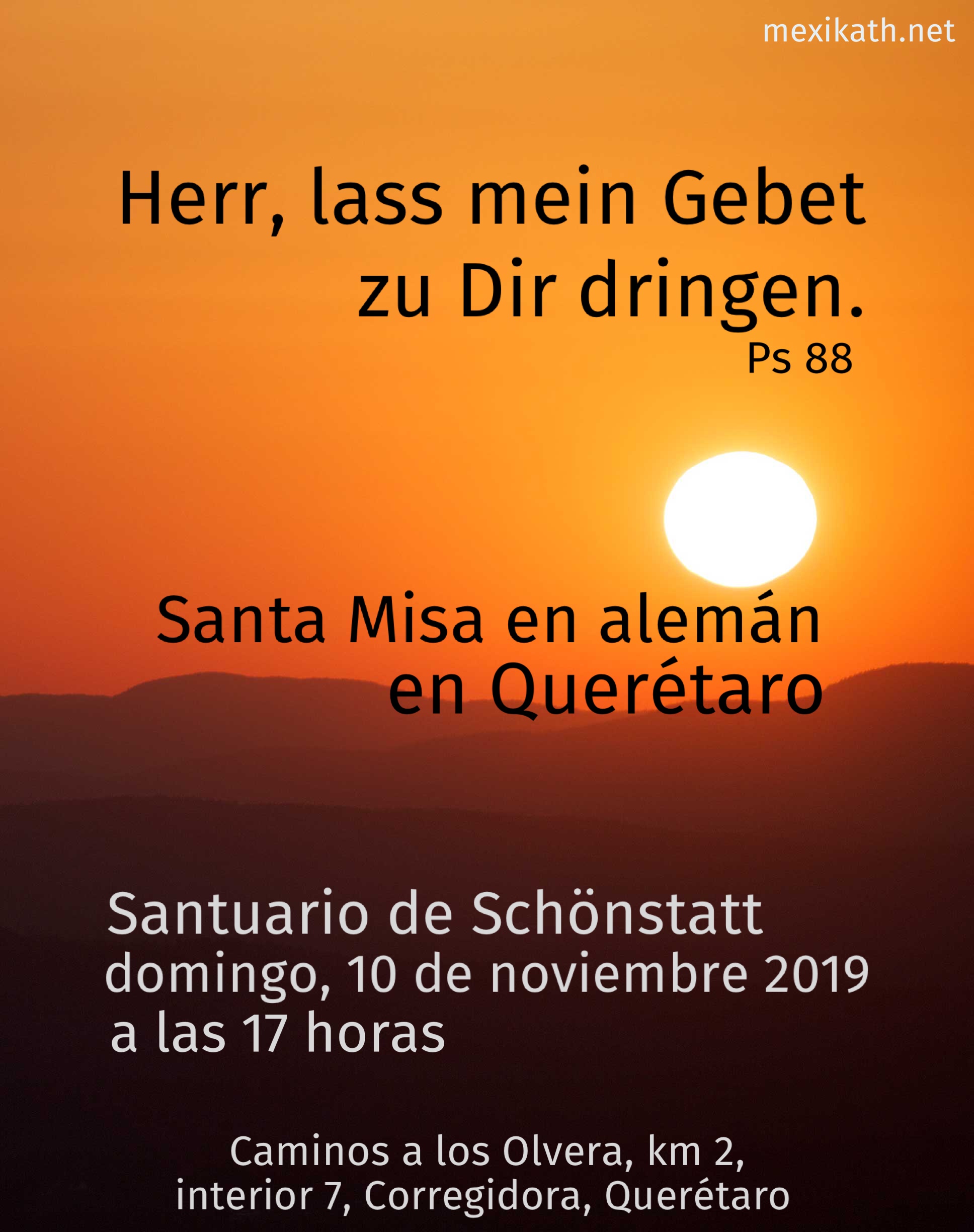 El domingo, 10 de noviembre celebraremos una Santa Misa en el idioma alemán en el Santuario de Schönstatt en Querétaro. La Misa empieza a las 5pm.