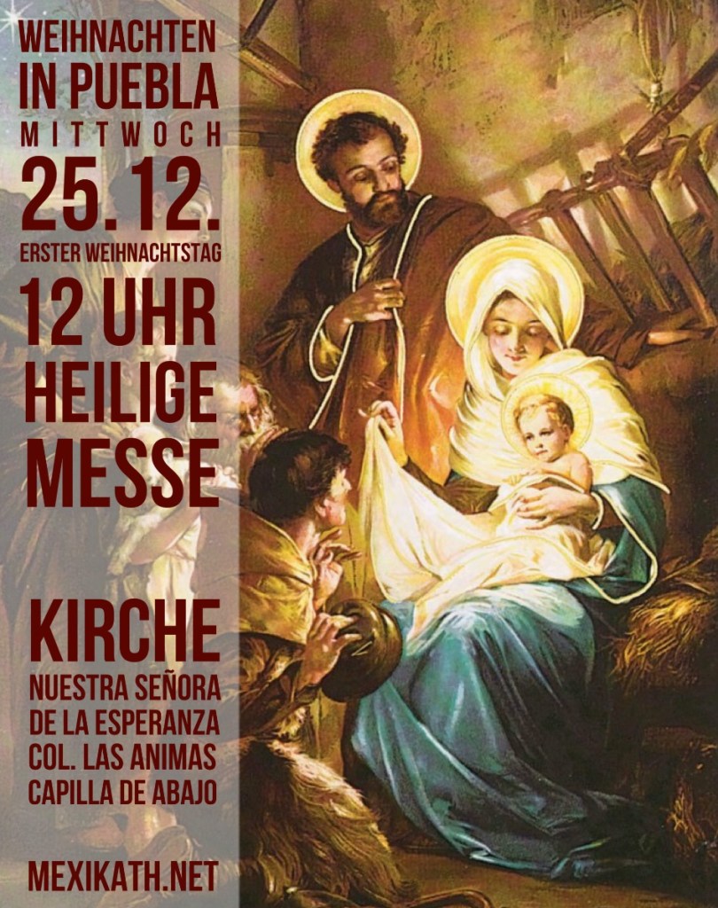 En navidad, el día 25 de diciembre, habrá una Santa Misa en el idioma alemán en Puebla. Nos reuniremos a las 12 del mediodía en la capilla debajo de la iglesia Nuestra Señora de la Esperanza en el Circuito Juan Pablo II en Las Animas. Vamos a escuchar el mensaje navideño del nacimiento del Niño Jesus y a cantar los villancicos más famosos de Alemania.