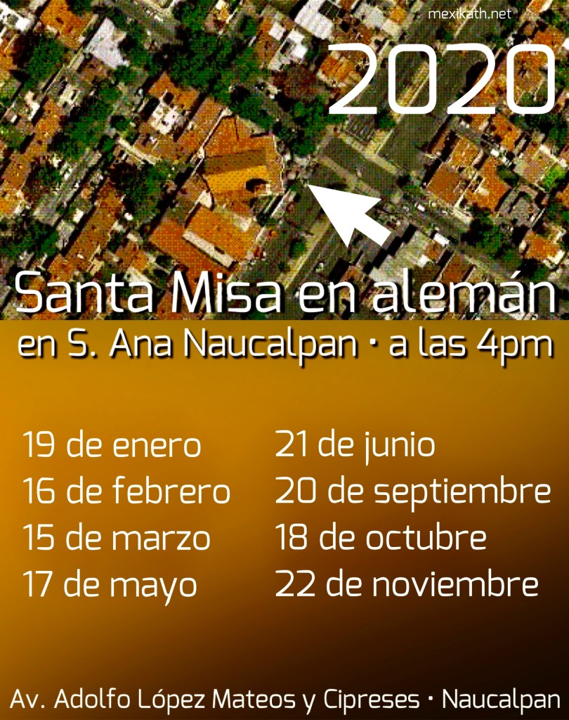 El domingo, 19 de enero celebramos la primera Santa Misa en este año en el idioma alemán en la Iglesia S.Ana en Naucalpan, cerca del Colegio Alemán Lomas Verdes. La misa empieza a las 4pm.
