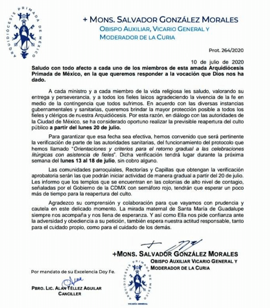 Nachdem vor einiger Zeit vom Erzbistum Mexiko-Stadt die Wiedereröffnung der Kirchen für die Feier der Hl. Messe für den 13. Juli 2020 in Aussicht gestellt worden war, erreichte uns in der vergangenen Woche untenstehende Mitteilung, dass die öffentlichen Gottesdienste wahrscheinlich wieder ab dem 20. Juli 2020 möglich sind.