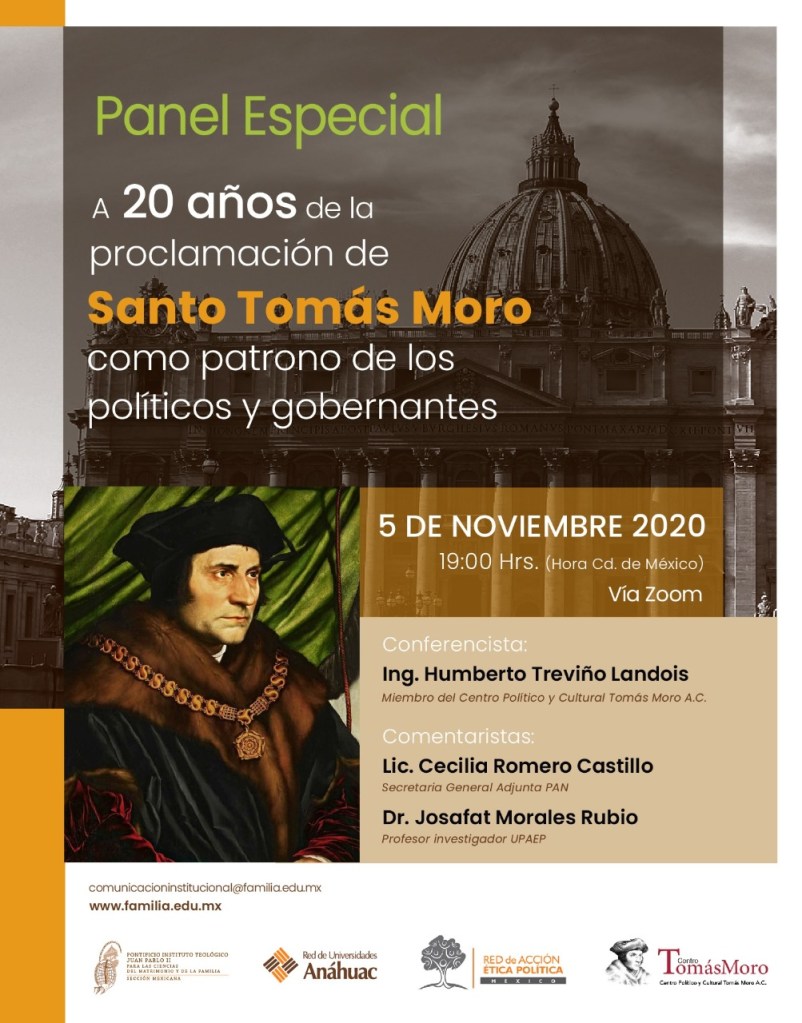 Con motivo de los 20 años de la proclamación de Santo Tomás Moro como patrono de los políticos y gobernantes se celebrará el día de hoy, 5 de noviembre 2020 a las 19 horas, un panel especial via zoom.