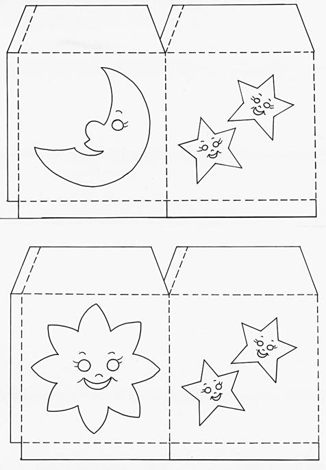 Die ausgeschnittenen Öffnungen hinterkleben Sie mit farbigem Transparentpapier, damit die Laterne später auch schön bunt leuchtet. Jetzt noch die Gesichtsteile aus schwarzem Karton zuschneiden: große Augen für Sonne und Mond, einen großen Mund für die Sonne und kleine Münder für die Sterne zuschneiden, die kleinen Augen für die Sterne mit dem Locher ausstanzen.