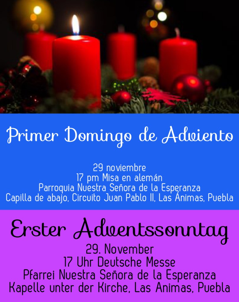 El próximo domingo es el primer adviento. Empezará un nuevo año litúrgico. Tenemos una Santa Misa en el idioma alemán el 29 de noviembre a las 5 pm en la iglesia Nuestra Señora de la Esperanza en Puebla. Nos vamos a reunir en la capilla de abajo: Circuito Juan Pablo II en Las Ánimas. ¡Sean todos bienvenidos!