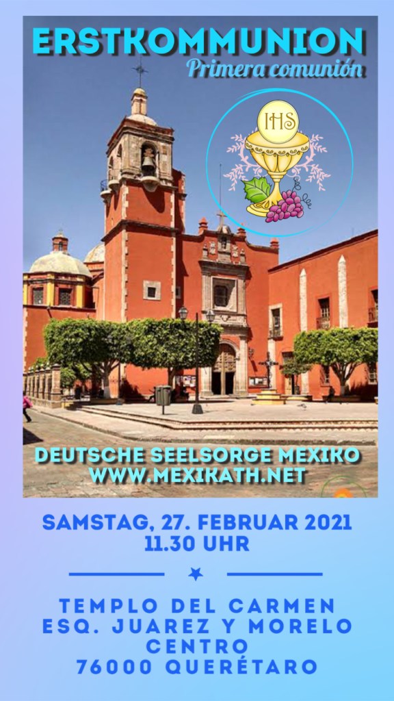 Am Samstag, dem 27. Februar 2021 feiern wir zum ersten Mal eine Erstkommunion in Querétaro. Die Hl. Messe in deutscher Sprache beginnt um 11.30 Uhr in der Kirche Nuestra Señora del Carmen im Zentrum (Ecke Juarez und Morelos). Die Zahl der Teilnehmer ist auf 60 Personen begrenzt uns es gelten die üblichen Hygienevorschriften (Mund-Nasen-Schutz, Mindestabstand und Handkommunion).