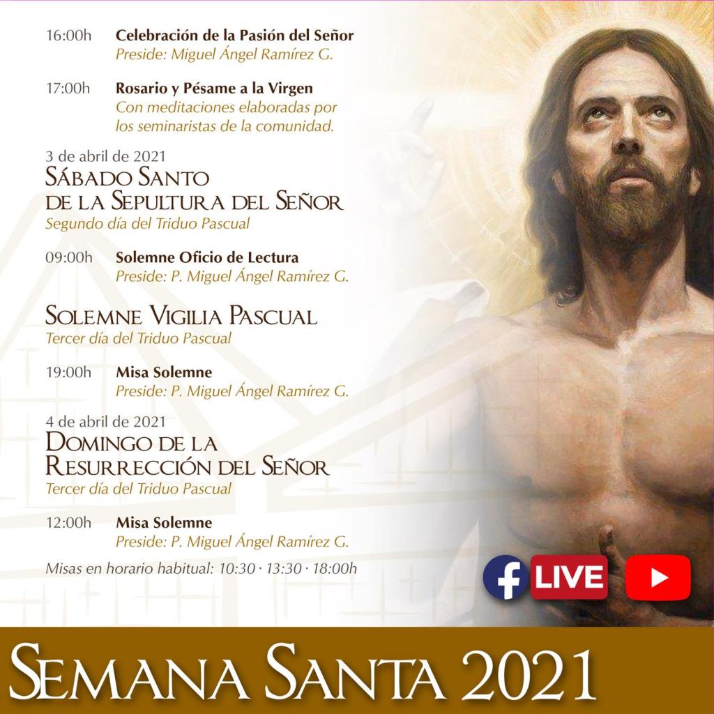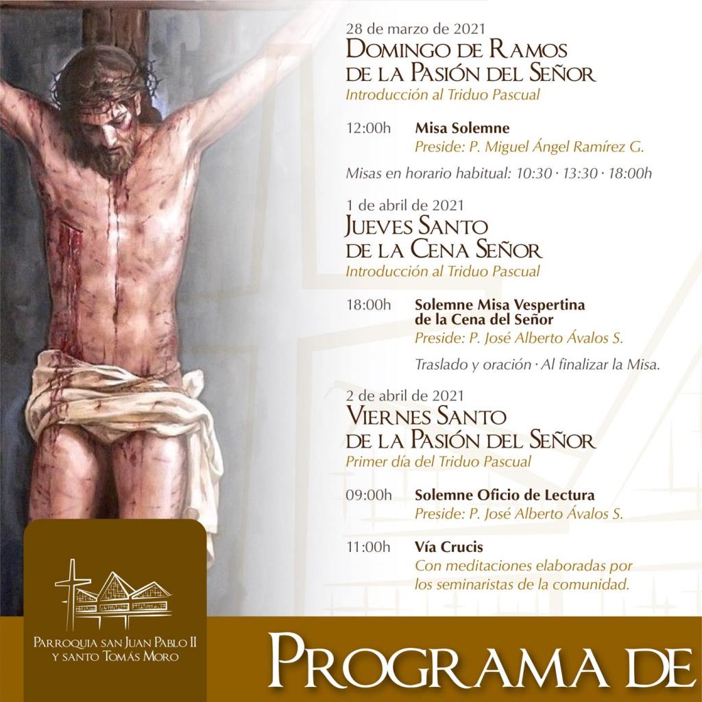 Durante la Semana Santa 2021 habrá todos los servicios religiosos en el templo san Juan Pablo II y Santo Tomás Moro con las medidas higiénicas correspondientes. Aquí pueden encontrar el horario de los eventos.