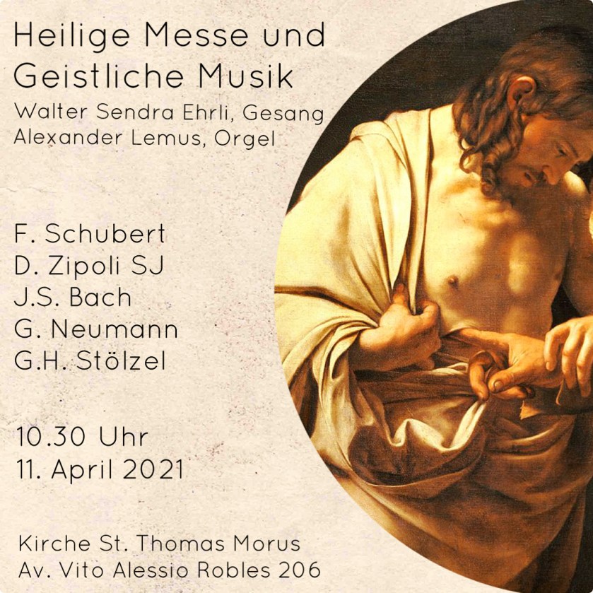 Am kommenden Sonntag, 11. April 2021 feiern wir den Weißen Sonntag oder den Sonntag der Göttlichen Barmherzigkeit. In der Hl. Messe um 10.30 Uhr bringen unsere Musiker Alexander Lemus (Orgel) und Walter Sendra-Ehrli (Gesang) Teile der Deutschen Messe von Franz Schubert und Werke des Gregorianischen Chorals zu Gehör. Im Anschluß an den Gottesdienst werden Werke von Johann Sebastian Bach, Domenico Zipoli und Gottfried Heinrich Stölzel erklingen.