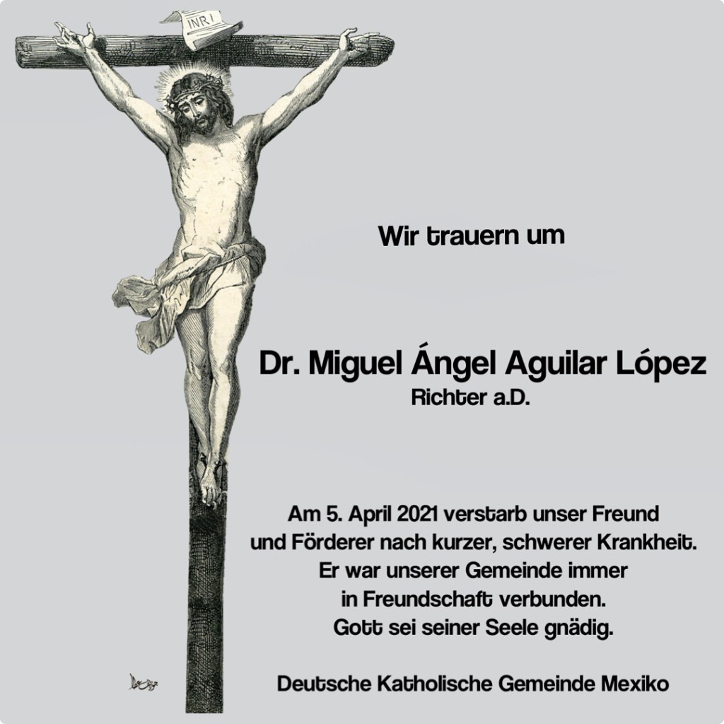 Comunicamos el sensible fallecimiento de nuestro amigo Dr. Miguel Ángel Aguilar López el día lunes, 5 de abril 2021. El deposito de sus cenizas se va a efectuar el día 15 de abril 2021 después de la Santa Misa, que empezará a las 3pm en la iglesia San Juan Pablo II y Santo Tomas Moro. ¡Que en paz descanse!