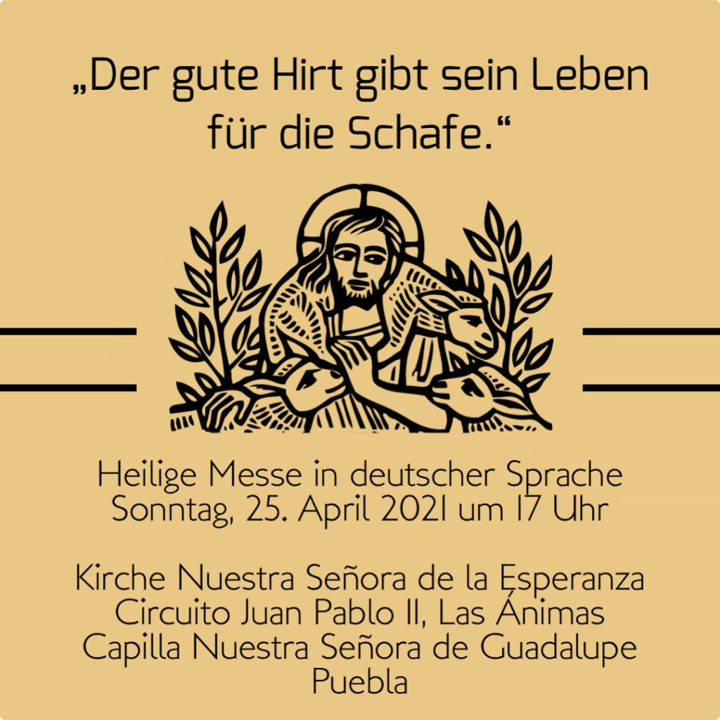 Am Sonntag, 25. April 2021 feiern wir die nächste Heilige Messe in deutscher Sprache in Mexiko. Der Gottesdienst beginnt um 17 Uhr in der Kapelle Nuestra Señora de Guadalupe in der Kirche in Las Ánimas. Herzliche Einladung.