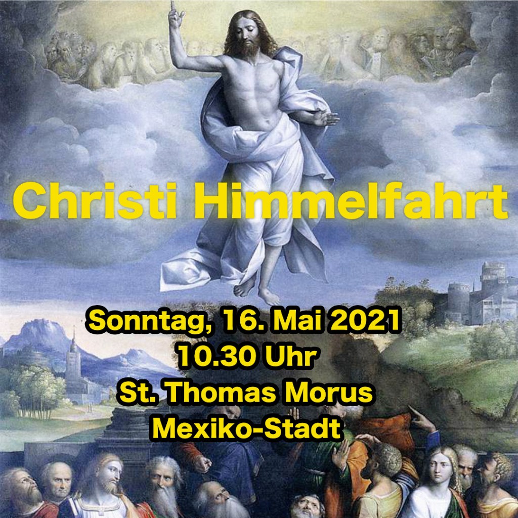 In Mexiko wird die liturgische Feier des Himmelfahrtstages auf den folgenden Sonntag verschoben. Am kommenden Sonntag, 16. Mai 2021 feiern wir daher das Hochfest der Himmelfahrt unseres Herrn um 10.30 Uhr in St. Thomas Morus. Die Texte der deutschen Messe finden Sie hier.