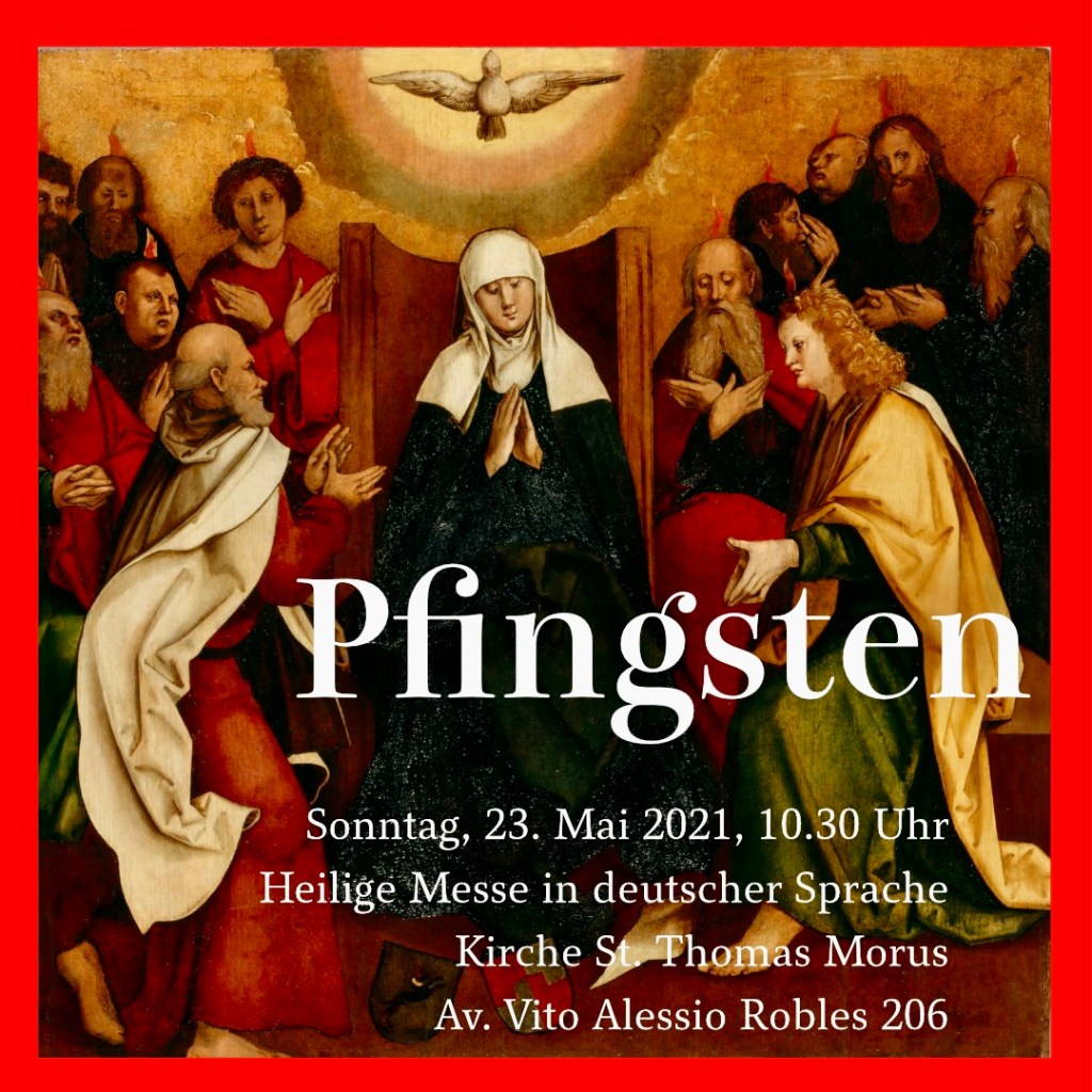Fünfzig Tage nach dem Osterfest feiern die Christen Pfingsten. Die Apostel empfingen an diesem Tag die Gaben des Heiligen Geistes. Wir treffen uns zur Feier der Hl. Messe in deutscher Sprache am Sonntag, 23.5.21 um 10.30 Uhr in St. Thomas Morus.