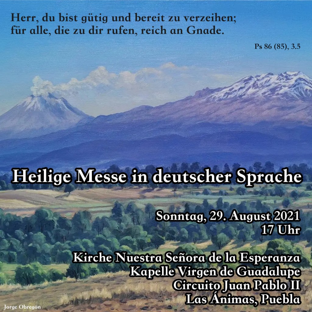 Cada mes celebramos un Santa Misa en el idioma Alemán en Puebla. En el mes de junio nos vamos a reunir el domingo 29 de agosto 2021 a las 5 pm. La misa tendrá lugar en la Capilla Nuestra Señora de Guadalupe que se encuentra debajo de la Iglesia de Las Ánimas en el Circuito Juan Pablo II. Las canciones de las misa y las traducciones al español se encuentran aquí.