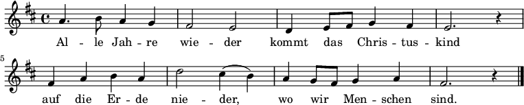 Alle Jahre wieder ist eines der bekanntesten Weihnachtslieder. Sein Text wurde 1837 von Wilhelm Hey verfasst. Die verbreitetste Melodie wird heute zumeist auf Hoffmann von Fallerslebens Gedicht „Abend wird es wieder“ gesungen.