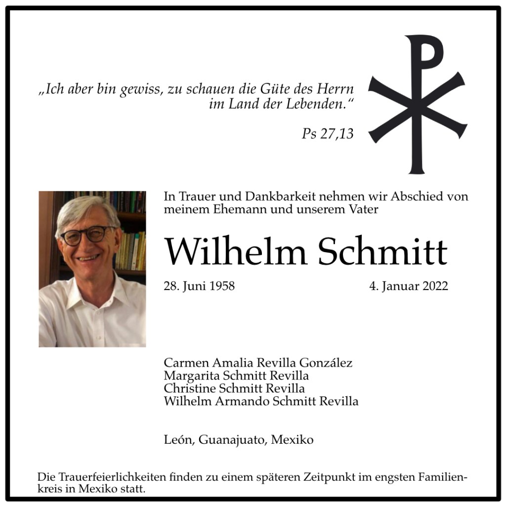 Im Alter von 68 Jahren verstarb am 4.1.22 in León, Guanajuato, Herr Wilhelm Schmitt. Fassungslos stehen wir diesem plötzlichen Tod gegenüber. Der lieben Ehefrau und den drei Kindern sprechen wir unsere herzliche Anteilnahme aus und empfehlen unseren verstorbenen Bruder der Barmherzigkeit Gottes: Herr, gib ihm die ewige Ruhe. Und das ewige Licht leuchte ihm. Herr lass ihn ruhen in Frieden. Amen.