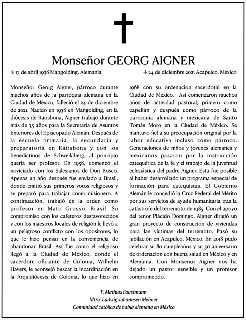 Monseñor Georg Aigner, párroco durante muchos años de la parroquia alemana en la Ciudad de México, falleció el 24 de diciembre de 2021. Nacido en 1938 en Mangolding, en la diócesis de Ratisbona, Aigner trabajó durante más de 35 años para la Secretaría de Asuntos Exteriores del Episcopado Alemán. Después de la escuela primaria, la secundaria y preparatoria en Ratisbona y con los benedictinos de Schweiklberg, al principio quería ser profesor. En 1958, comenzó el noviciado con los Salesianos de Don Bosco. Apenas un año después fue enviado a Brasil, donde emitió sus primeros votos religiosos y se preparó para trabajar como misionero. A continuación, trabajó en la orden como profesor en Mato Grosso, Brasil. Su compromiso con los cafeteros desfavorecidos y con los maestros locales de religión le llevó a un peligroso conflicto con los opositores, lo que le hizo pensar en la conveniencia de abandonar Brasil. Así fue como el religioso llegó a la Ciudad de México, donde el sacerdote oficiante de Colonia, Wilhelm Havers, le aconsejó buscar la incardinación en la Arquidiócesis de Colonia, lo que hizo en 1968 con su ordenación sacerdotal en la Ciudad de México. Así comenzaron muchos años de actividad pastoral, primero como capellán y después como párroco de la parroquia alemana y mexicana de Santo Tomás Moro en la Ciudad de México. Se mantuvo fiel a su preocupación original por la labor educativa incluso como párroco. Generaciones de niños y jóvenes alemanes y mexicanos pasaron por la instrucción catequética de la fe y el trabajo de la juventud eclesiástica del padre Aigner. Esta fue posible al haber desarrollado un programa especial de formación para catequistas. El Gobierno Alemán le concedió la Cruz Federal del Mérito por sus servicios de ayuda humanitaria tras la catástrofe del terremoto de 1985. Con el apoyo del tenor Plácido Domingo, Aigner dirigió un gran proyecto de construcción de viviendas para las víctimas del terremoto. Pasó su jubilación en Acapulco, México. En 2018 pudo celebrar su 80 cumpleaños y su 50 aniversario de ordenación con buena salud en México y en Alemania. Con Monseñor Aigner nos ha dejado un pastor sensible y un profesor comprometido.