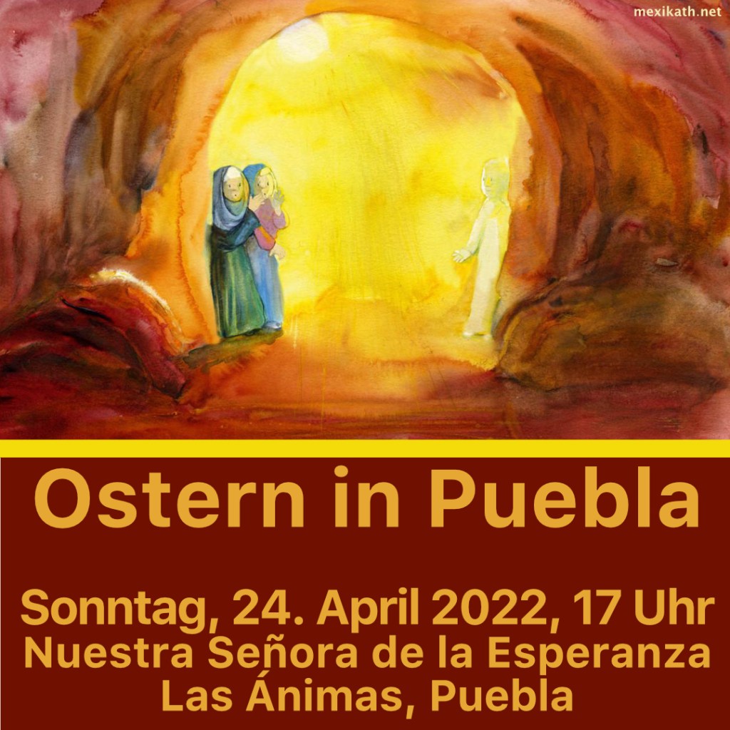Der Gottesdienst zum Osterfest findet in Puebla am kommenden Sonntag, dem 24. April 2022 statt. Die Hl. Messe fängt um 17 Uhr an. Wir treffen uns in der Kapelle unter der Kirche Nuestra Señora de la Esperanza in Las Ánimas. Herzlich willkommen.