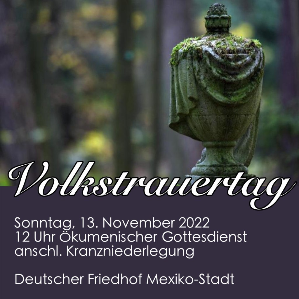 Anläßlich des Volkstrauertages 2022 laden wir herzlich zu einem Ökumenischen Totengedenken auf dem Deutschen Friedhof in Mexiko-Stadt ein. Am Sonntag, dem 13. November 2022 beginnen wir um 12 Uhr mit einem Ökumenischen Gottesdienst in der Calzada México – Tacuba 1131, 11230 Ciudad de México, anschließend wird es Ansprachen und eine Kranzniederlegung durch Botschafter Wolfgang Dold geben.