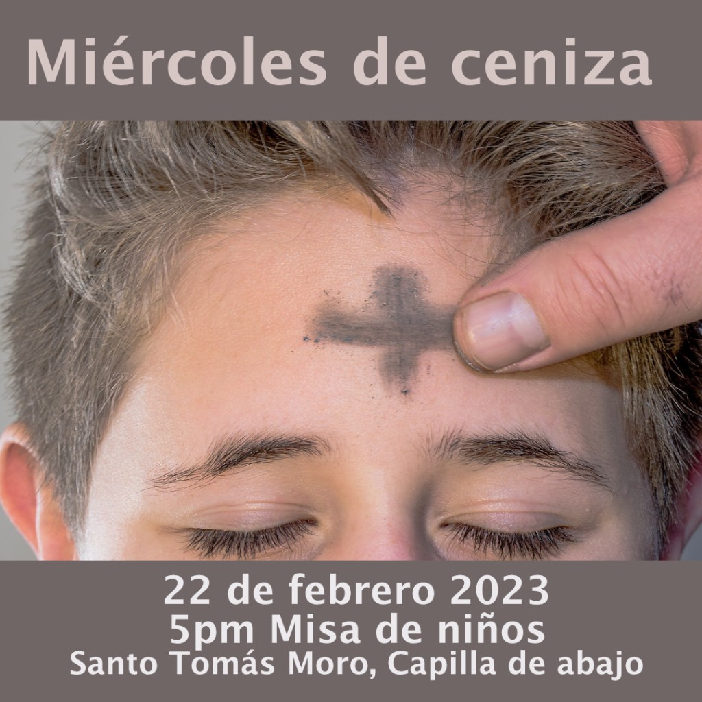 El día Miércoles de ceniza, el 22 de febrero 2023, celebramos la Santa Misa a las 5 pm en la capilla de abajo en Santo Tomás Moro. Vamos a bendecir y imponer las cenizas para empezar los 40 días de la cuaresma.