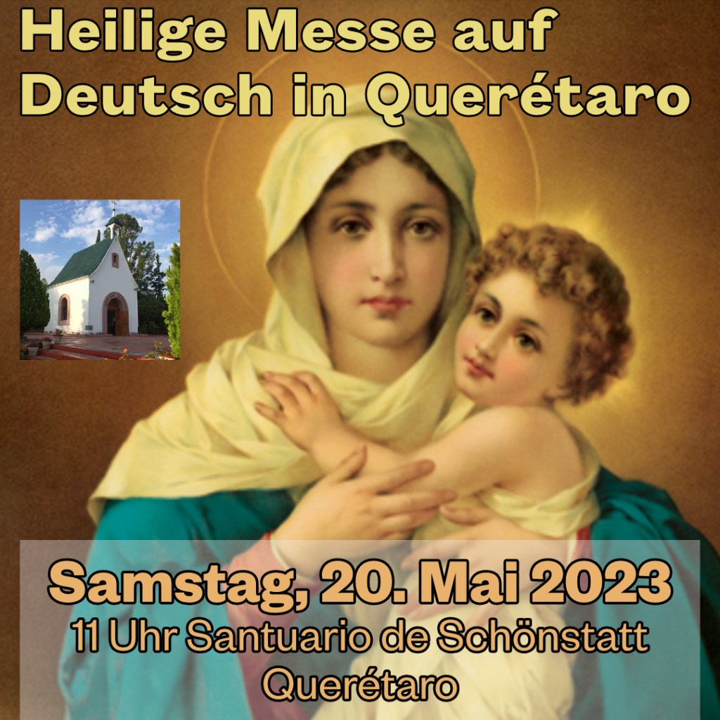 El sábado, 20 de mayo 2023 vamos a tener nuestra próxima misa en el idioma alemán en el Santuario de Schönstatt de Querétaro. Empezamos a las 11 am en punto en el Camino a los Olvera km 2, Los Olvera, 77904 Los Olvera, Querétaro. Sean todos muy bienvenidos.