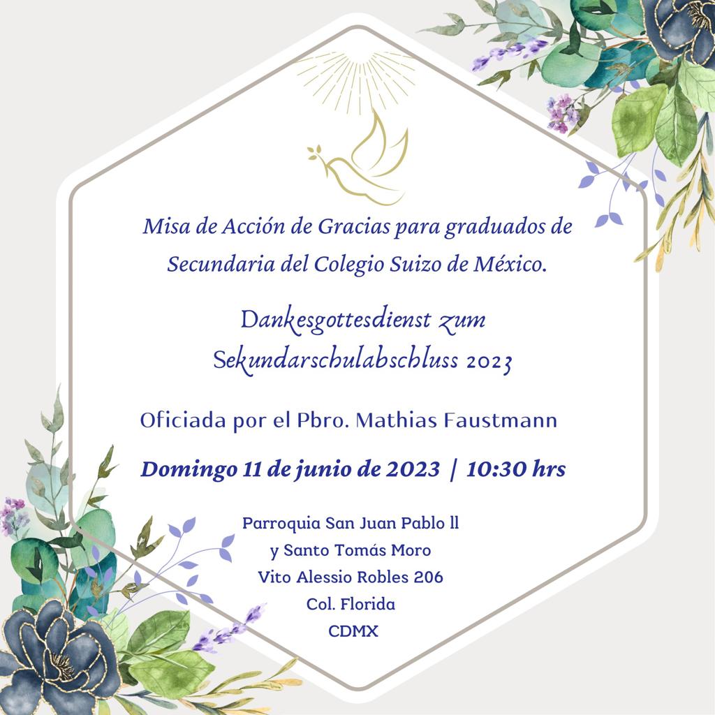 Die Absolventen der Sekundaria der Schweizer Schule in Mexiko-Stadt feiern einen Dankgottesdienst anläßlich ihres Schulabschusses. Die Heilige Messe ist am Sonntag, dem 11. Juni 2023 um 10.30 Uhr in der Kirche St. Thomas Morus in der Av. Vito Alessio Robles 206. Auch alle anderen Gemeindemitglieder und Interessierte sind herzlich eingeladen.
