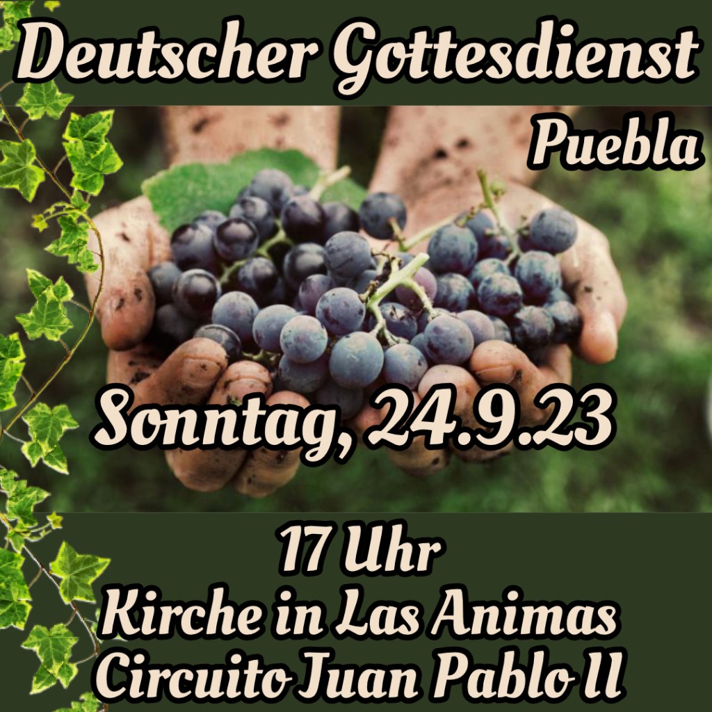 Nach der Sommerpause laden wir wieder herzlich zum deutschsprachigen Gottesdienst in Puebla ein. Wir treffen uns am Sonntag, dem 24. September 2023 um 17 Uhr in der kleinen Kapelle unter der Kirche Nuestra Señora de la Esperanza in Las Ánimas, Circuito Juan Pablo II.