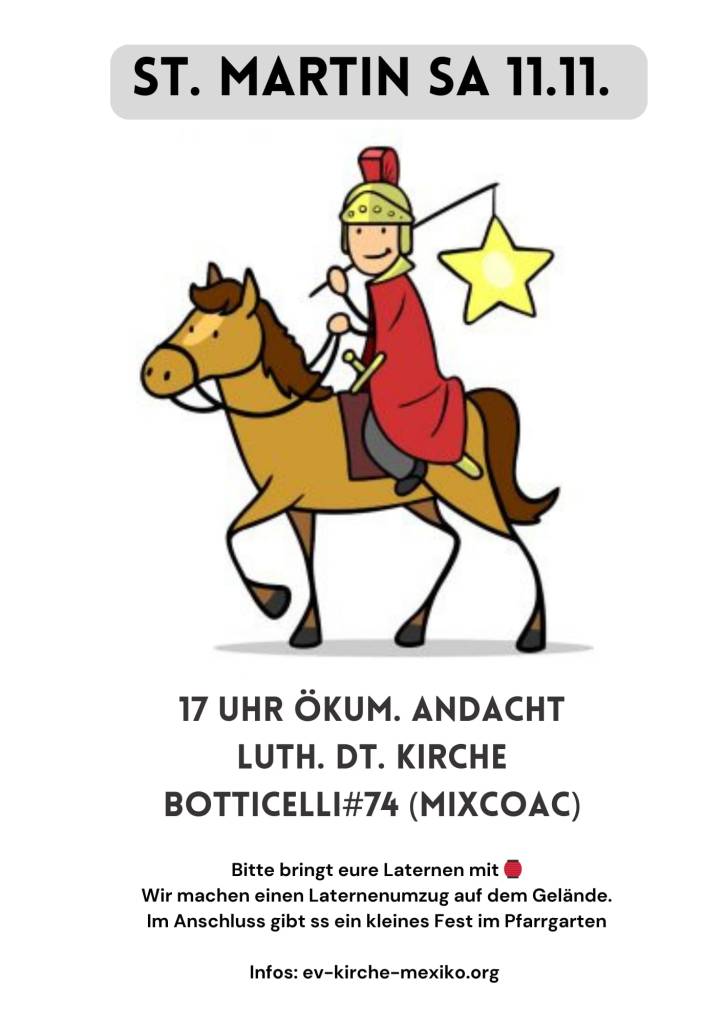 Das St. Martinsfest in Mexiko-Stadt findet in diesem Jahr am Samstag, dem 11.11.23 um 17 Uhr in der Lutherischen Kirche Heilig Geist in der Calle Botticelli 74 in Mixcoac statt. Herzliche Einladung.