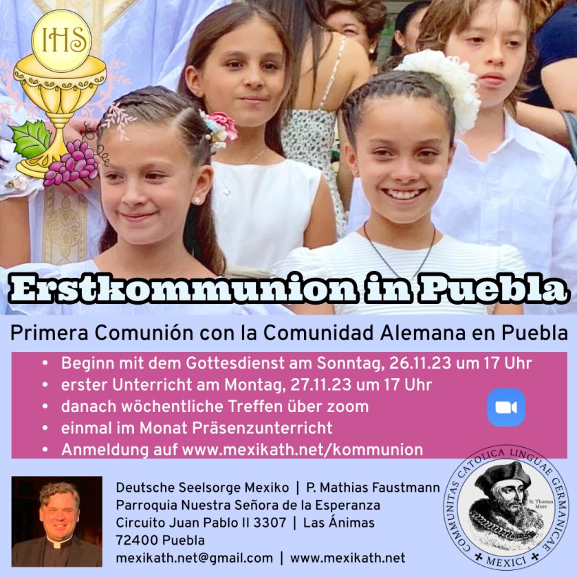 Con la Santa Misa del domingo 26 de noviembre 2023 a las 5 pm vamos a empezar un nuevo curso preparatorio para la Primera Comunión con la Comunidad Alemana en Puebla. La Santa Misa tendrá lugar como siempre en la Capilla debajo de la Iglesia Nuestra Señora de la Esperanza en Las Ánimas, Circuito Juan Pablo II. Las clases se darán una vez por semana por zoom y en otras ocasiones en forma presencial. El primer encuentro será presencial el día lunes 27 de noviembre 2023 a las 5 pm en los salones parroquiales de esta misma iglesia.