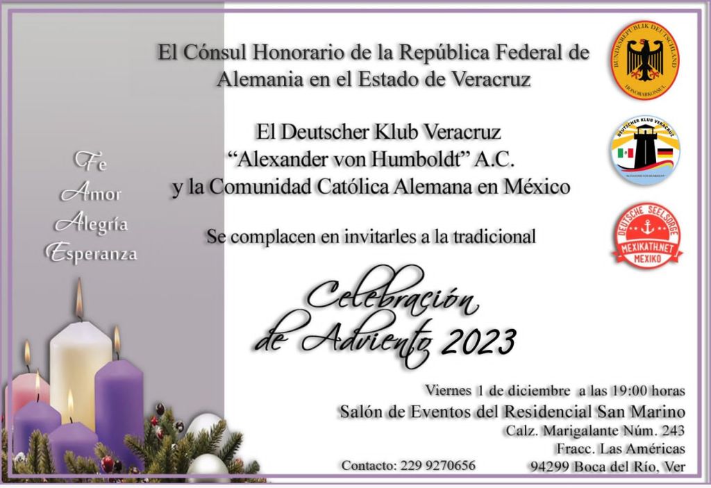 El viernes 1 de diciembre vamos a tener nuestra celebración de adviento en Veracruz. El Deutscher Klub Veracruz Alexander von Humboldt A.C. y el Consulado de Alemania en los Estados de Veracruz y Chiapas invitan cordialmente a las 7pm a una Santa Misa en el Salón de Eventos del Residencial San Marino. En continuación habrá convivencia.
