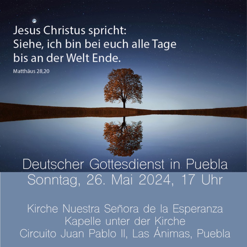 Wir feiern wieder einen deutschsprachigen Gottesdienst in Puebla. Am Sonntag, dem 26. Mai 2024 um 17 Uhr treffen wir uns in der kleinen Kapelle unter der großen Kirche Nuestra Señora de la Esperanza. Die Kirche befindet sich im Circuito Juan Pablo II in Las Animas. Alle sind herzlich eingeladen.