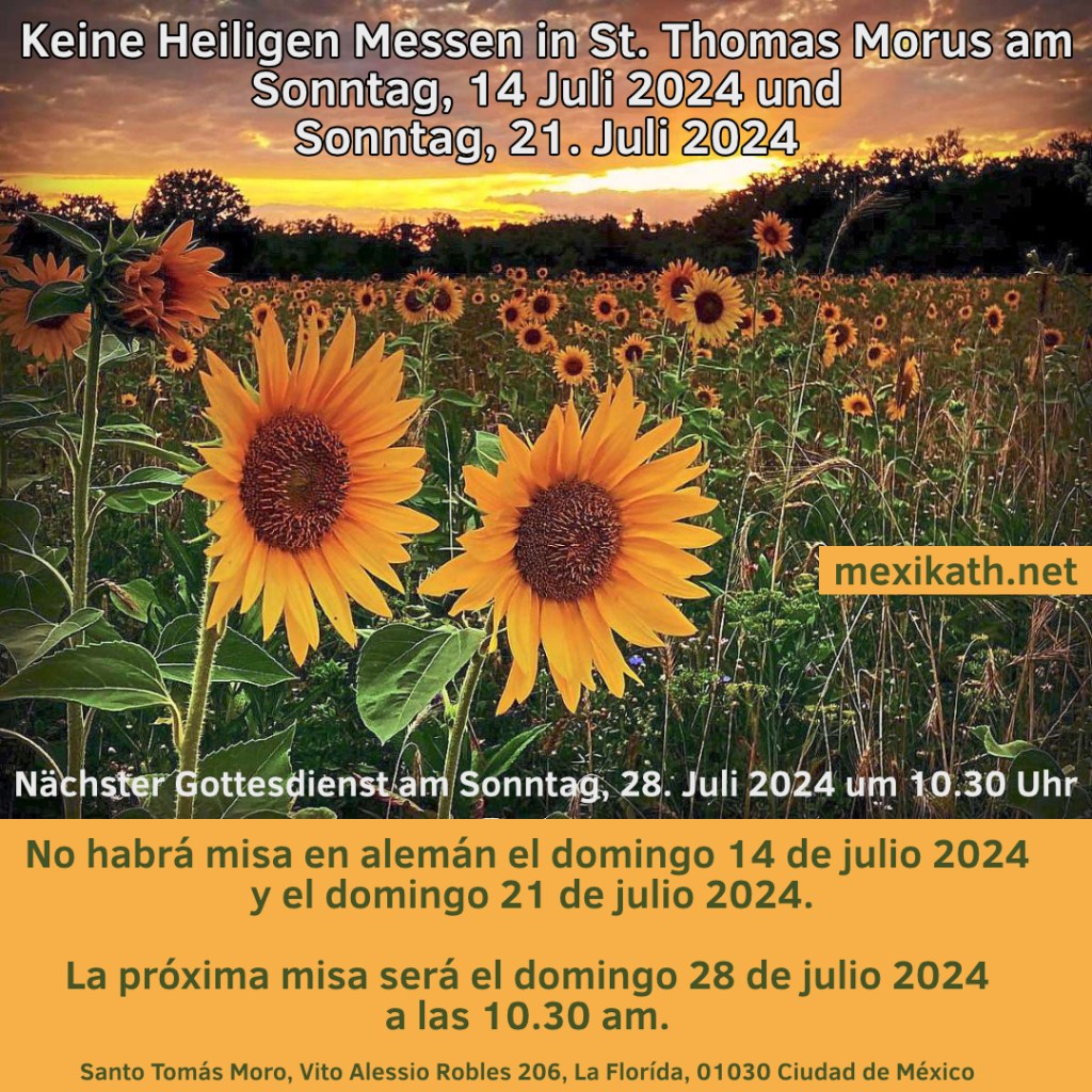 Am Sonntag, dem 14. und am Sonntag, dem 21. Juli 2024 entfallen die deutschsprachigen Gottesdienste in St. Thomas Morus in Mexiko-Stadt. Die nächste Heilige Messe in deutscher Sprache wird am Sonntag, dem 28. Juli 2024 um 10.30 Uhr sein.