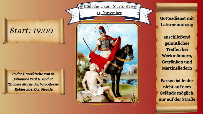El sábado 15 de noviembre de 2025, a las 7 pm, celebraremos un servicio ecuménico en la capilla debajo de San Juan Pablo II y Santo Tomás Moro junto con la comunidad evangélica de habla alemana en México. En seguido, nos dirigiremos con linternas y canciones de San Martín a la sala parroquial para disfrutar de un agradable encuentro con bebidas y panes dulces de San Martín. ¡Qué sean todos bienvenidos, especialmente las familias con niños!