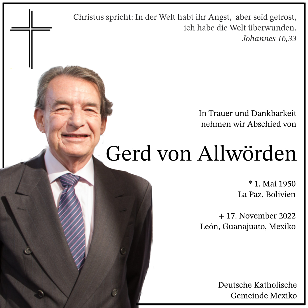 - Wir beten für unseren Verstorbenen Bruder Gerd von Allwörden, der plötzlich und unerwartet von uns gegangen ist. Schenke ihm nun das ewige Leben und seinen Angehörigen und Freunden den Trost des Glaubens an die Auferstehung.