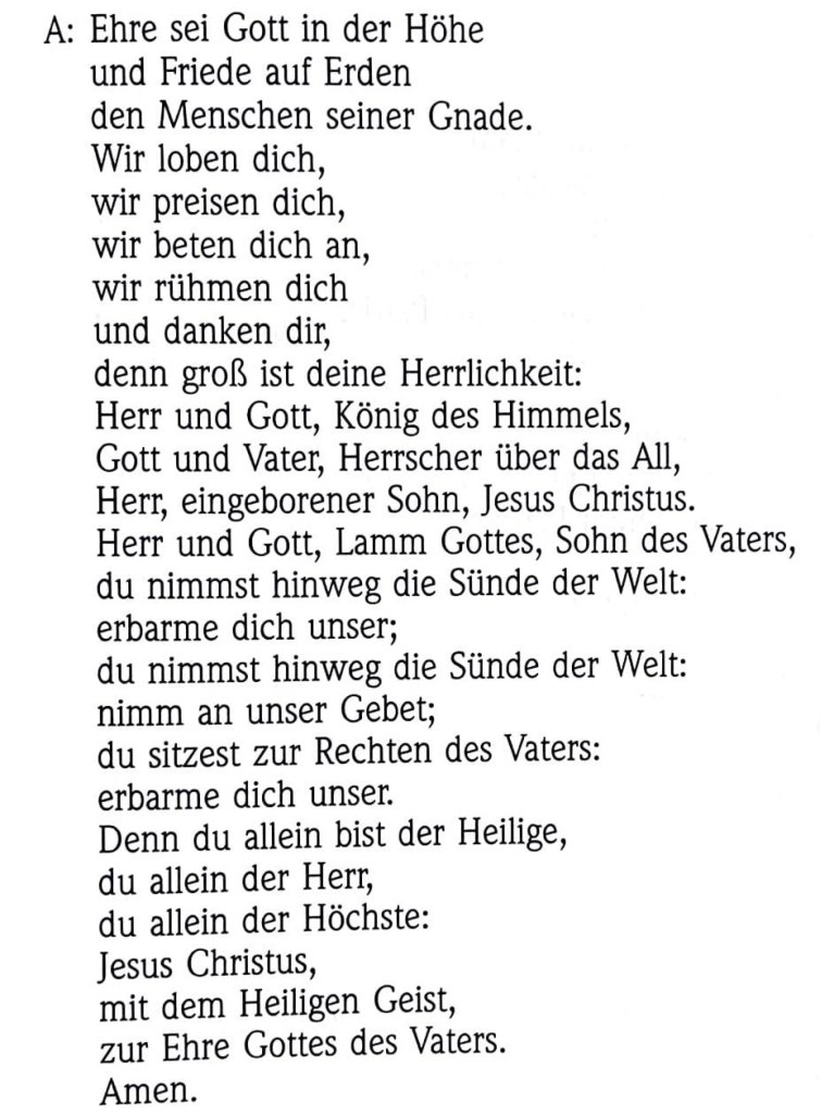 Ich bekenne Gott, dem Allmächtigen, und allen Brüdern und Schwestern, dass ich Gutes unterlassen und Böses getan habe – ich habe gesündigt in Gedanken, Worten und Werken durch meine Schuld, durch meine Schuld, durch meine große Schuld. Darum bitte ich die selige Jungfrau Maria, alle Engel und Heiligen und euch, Brüder und Schwestern, für mich zu beten bei Gott, unserem Herrn.