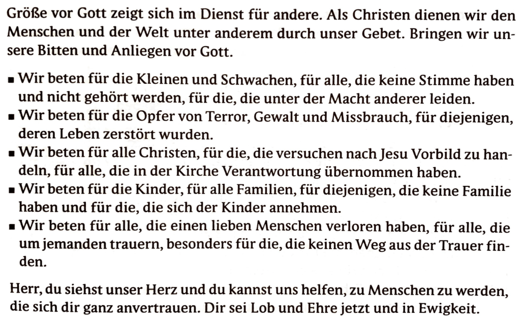 Ich bekenne Gott, dem Allmächtigen, und allen Brüdern und Schwestern, dass ich Gutes unterlassen und Böses getan habe – ich habe gesündigt in Gedanken, Worten und Werken durch meine Schuld, durch meine Schuld, durch meine große Schuld. Darum bitte ich die selige Jungfrau Maria, alle Engel und Heiligen und euch, Brüder und Schwestern, für mich zu beten bei Gott, unserem Herrn.