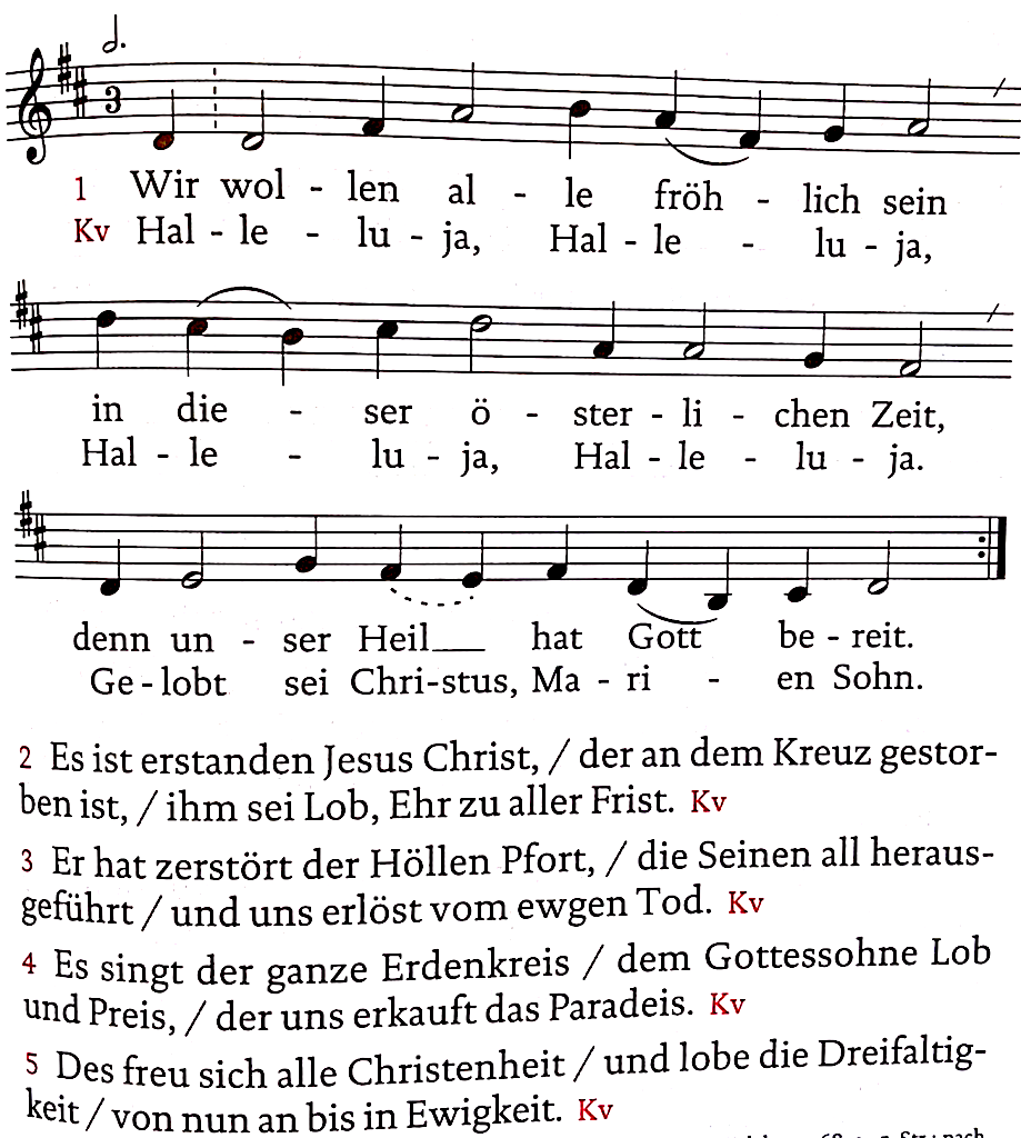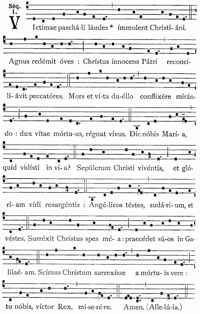 | Ofrezcan los cristianos ofrendas de alabanza a gloria de la Víctima propicia de la Pascua. | Singt das Lob dem Osterlamme, bringt es ihm dar, ihr Christen. |