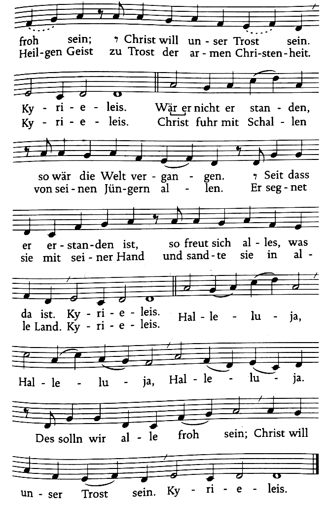 | Rey vencedor, apiádate de la miseria humana y da a tus fieles parte en tu victoria santa. | Du Sieger, König, erbarme dich. |