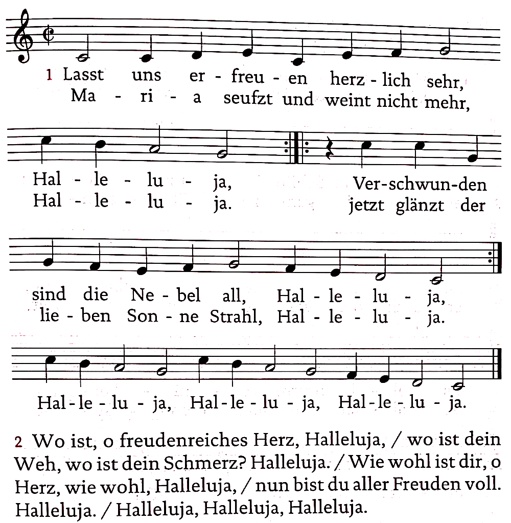 | “¿Qué has visto de camino, María, en la mañana?’’ “A mi Señor glorioso, la tumba abandonada, | Sag uns, Maria, was hast du auf dem Wege gesehen? Ich sah das Grabmal Christi, des Lebenden, und die Herrlichkeit des Auferstandenen. |