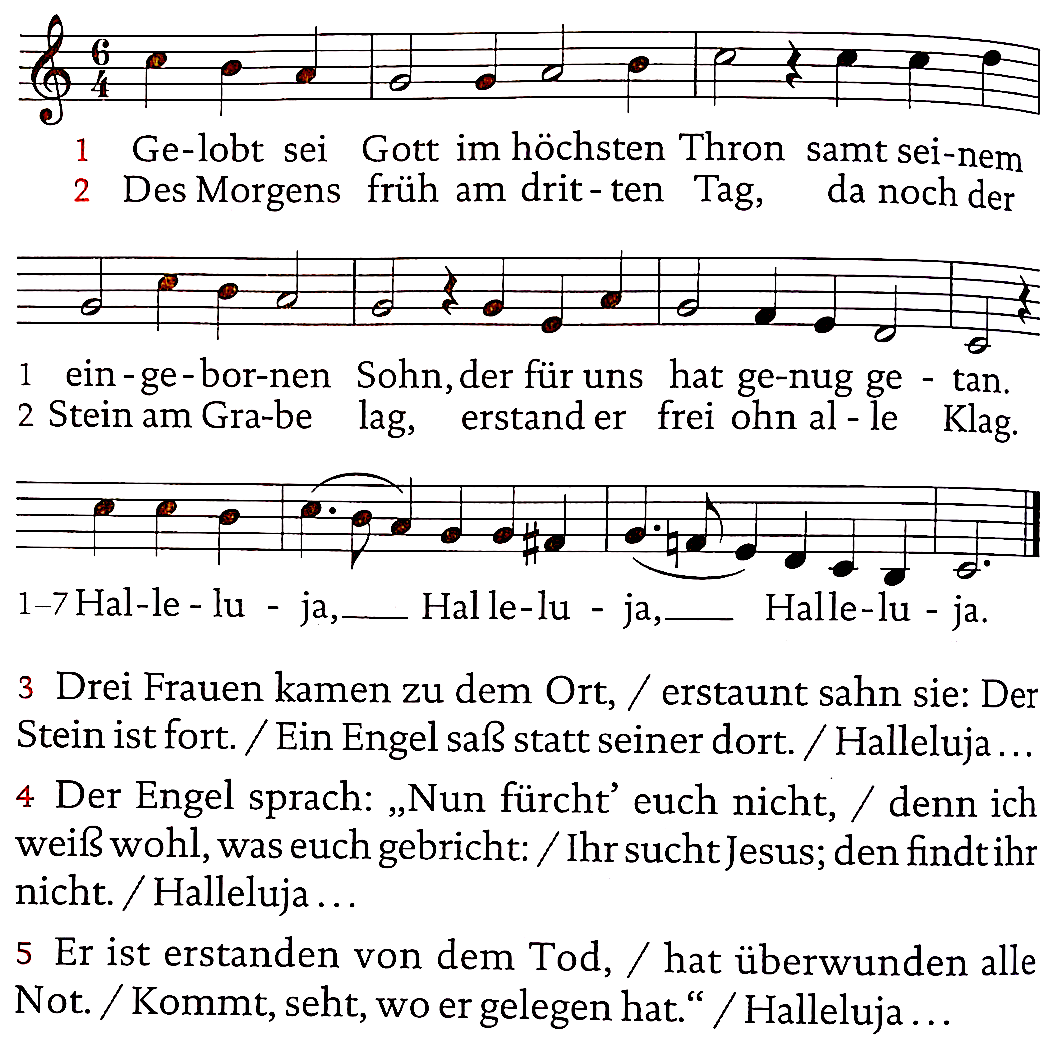 | Primicia de los muertos, sabemos por tu gracia que estás resucitado; la muerte en ti no manda. | Wir wissen: Christus ist auferstanden, wahrhaft vom Tod. |