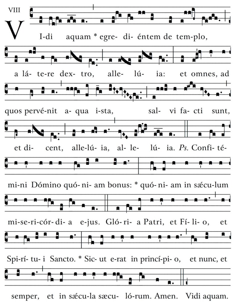 Antes de empezar la Santa Misa el sacerdote rocía los fieles con el agua bendita de la vigilia de pascua. Mientras se canta el canto Vidi aquam.